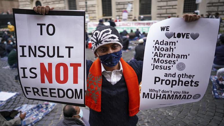 مکرون در اظهارات خود از حق آزادی بیان مجله فکاهی شارلی ابدو برای چاپ دوباره کاریکاتور پیامبر اسلام دفاع کرده است. امری که برای مسلمانان تابو و توهینآمیز بهحساب میشود.