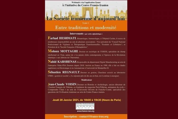 به ابتکار مرکز «ایران و فرانسه» (سمن فرانسوی، تاسیس شده در سال ۱۳۹۵) وبیناری با عنوان «جامعه امروزه ایران، میان سنت و مدرنیته» با حضور اساتید، محققین ایرانی و فرانسوی برگزار خواهد شد.