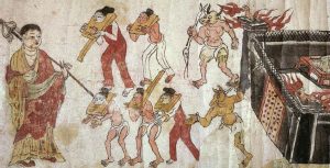 دو مرد خشمگین بدون گفتن کلمهای، او را بستند و به زیر زمین کشاندند و میمونشاه اسیر را با چهره مودارَش، به ورودی شهر رساندند. میمونشاه در آن هنگام سرش را بالا آورد و نوشتهای را بالای ورودی دید: «قلمرو تاریکی[7]». ناگهان بیدار و هوشیار شد و گفت: چرا مرا به اینجا آوردهاید؟» او میگریست و میگفت: «قلمرو تاریکی، جایگاه یاما[8]، پروردگار مرگ است». مأموران غرغرکنان زمزمه میکردند: «به ما دستور دادهاند تا شما را دستگیر کنیم». آنان تلاش کردند میمونشاه را به شهر ببرند، اما او خشمگین شد و سوزنش را از پشت گوشش بیرون آورد و آن را به چماقی غولپیکر بدل کرد و فرستادگان قلمرو تاریکی را راند.