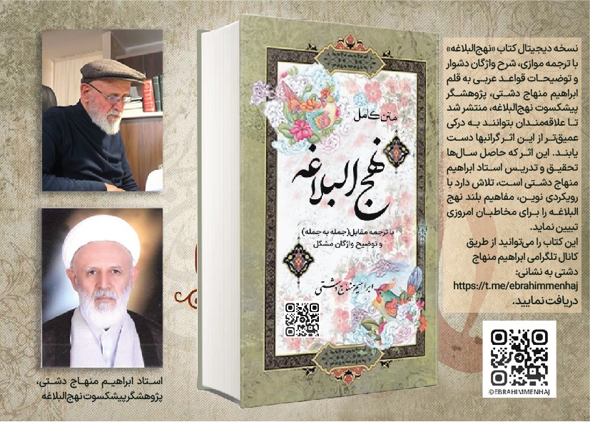 نسخه دیجیتال کتاب «نهجالبلاغه» با ترجمه موازی، شرح واژگان دشوار و توضیحات قواعد عربی به قلم ابراهیم منهاج دشتی، پژوهشگر پیشکسوت نهجالبلاغه، منتشر شد تا علاقهمندان بتوانند به درکی عمیقتر از این اثر گرانبها دست یابند. این اثر که حاصل سالها تحقیق و تدریس استاد منهاج دشتی است، تلاش دارد با رویکردی نوین، مفاهیم بلند نهجالبلاغه را برای مخاطبان امروزی تبیین نماید.
